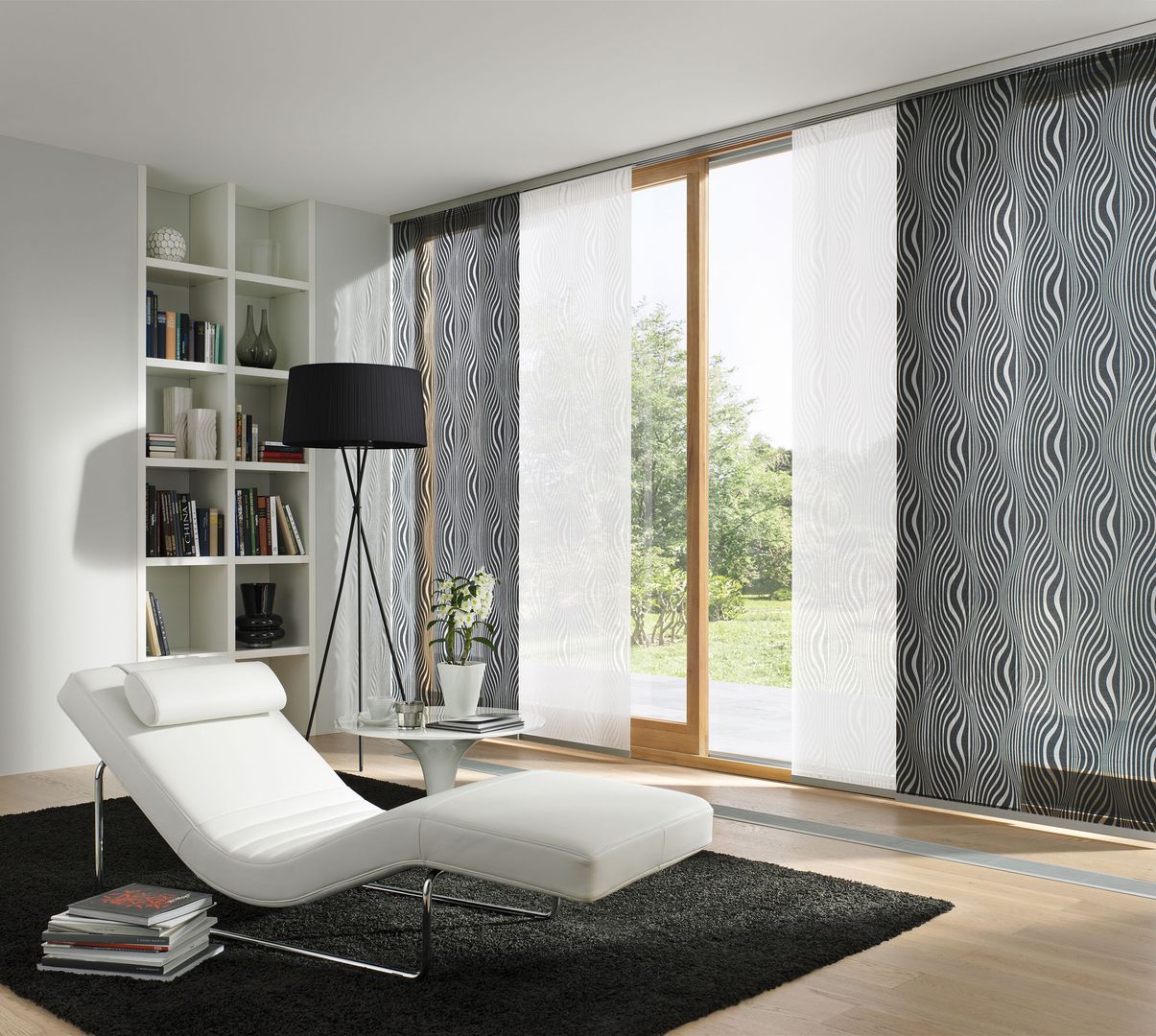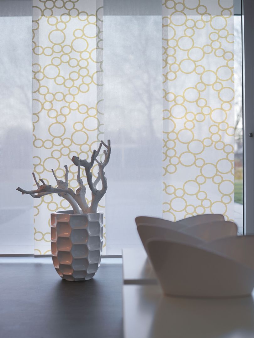 Die Paneele sind in individuellen Größen und praktisch unendlich vielen verschiedenen Stoffdesigns erhältlich. Die Paneele lassen sich einfach abnehmen und austauschen (Befestigung mittels Klettband). Die Montage der Schiebevorhänge erfolgt wahlweise an Wand oder Decke. Besonders für große Fenster, Glasfronten oder als Raumteiler bestechen Flächenvorhänge mit ihrer modernen, reduzierten Formensprache.